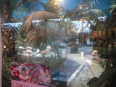 このお店の魅力は「フラミンゴ」が放し飼いにされている姿をガラス越しの客席で見れる。 |
