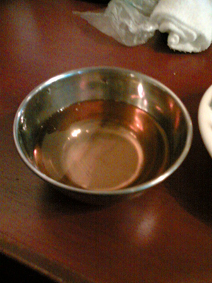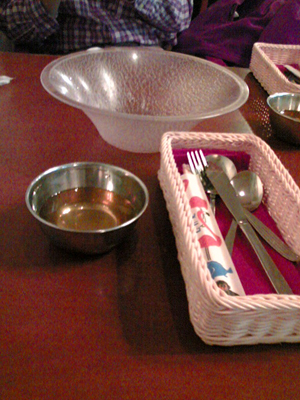 ん?これは・・・以前カレー専門店で見たことあるなあ・・・、 そう、フィンガーボール!カレーを手で食べるので指を洗うためのものだ。 お手拭は別にきてるし、もしかして手で食べるのか? |