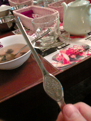 スープとサラダを食べようとフォークとスプーンを取ると こんなものが混ざってる…これってカニをそのまま食べる時に使う道具だが… フィンガーボールと何か関連があるのだろうか 次に私たちは衝撃の真実を知る…ってテレビで最近多いッすね(笑)。 |